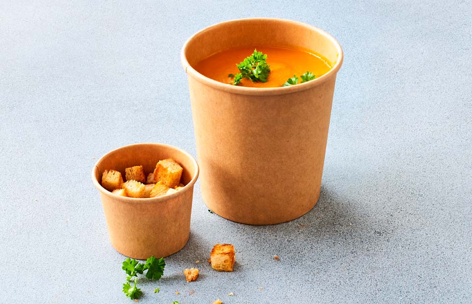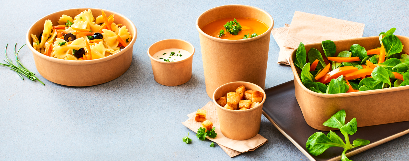 Unser BioBipack Sortiment umfasst Schalen und Becher aus Kraftpapier mit PE-Beschichtung und kompatiblen, separaten, recycelbaren Deckeln aus PET, PP und Kraftpapier.